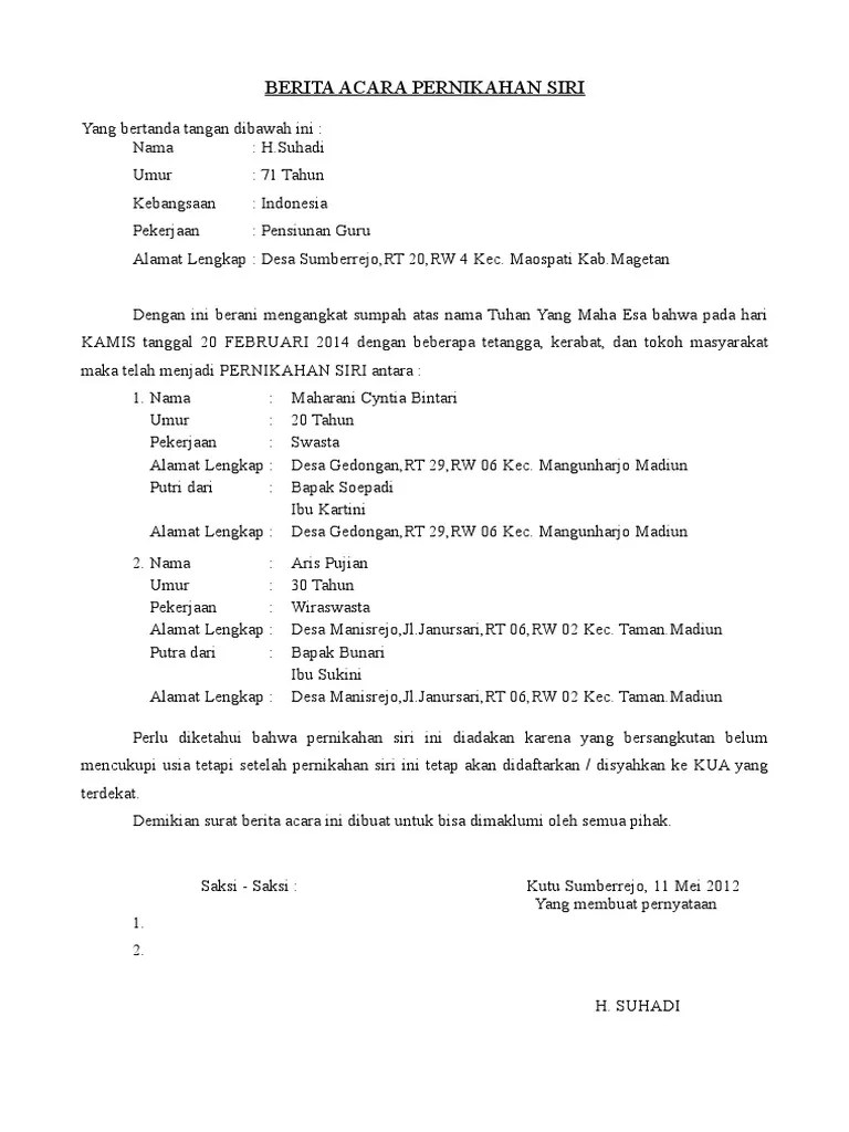 Adalah istri saya yang sudah saya nikahi secara sah menurut hukum agama islam pada tanggal 6 agustus 2020 dalam keadaan sadar dan tanpa adanya . Contoh surat keterangan nikah siri doc have an image from . 5 contoh surat nikah numpang nikah nikah siri cara. Adalah istri saya yang sudah saya nikahi secara sah menurut hukum agama islam pada tanggal 13 november 2020 dalam keadaan sadar dan tanpa adanya . This document was uploaded by user .
